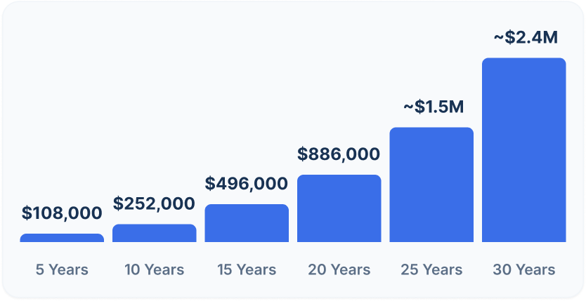 The Compound Effect: A client with a household income of $400,000, maintaining a 20% savings rate, and starting with a $1 million portfolio would build over $1.5 million of additional wealth after 25 years and almost $2.5 million of additional wealth after 30 years under our flat fee model compared to a traditional advisor charging a 1% AUM fee.